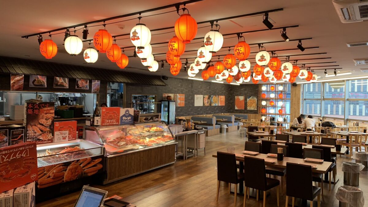【築地かに祭り】と書かれた赤い大きな看板が目印。自然光が差し込む明るい店内は、築地ならではのにぎやかな雰囲気が魅力です!お席は、木の温もりを感じるテーブル60席を完備。